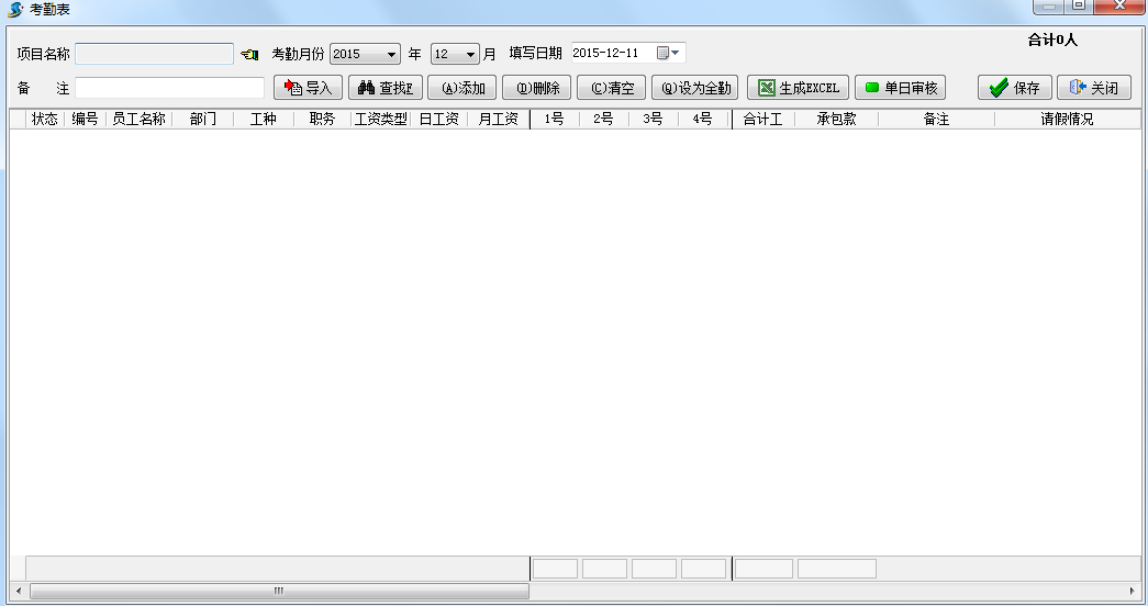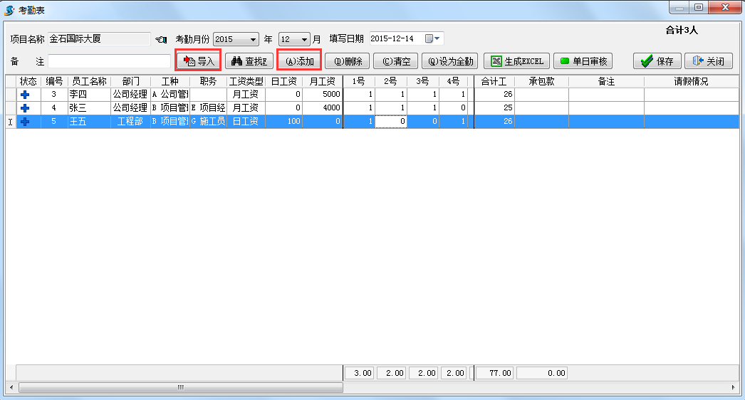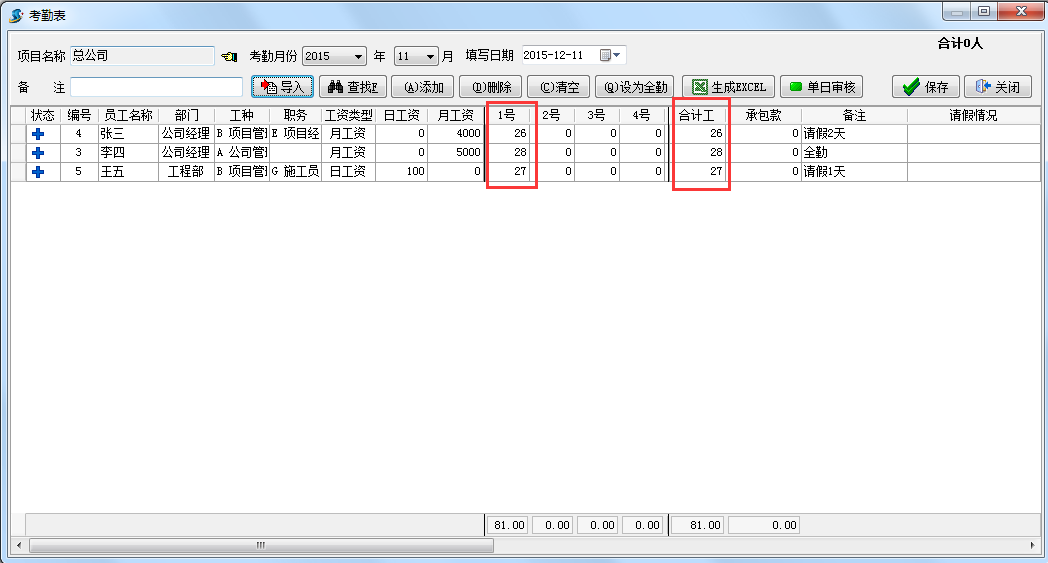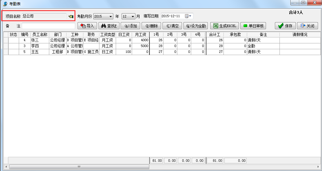 在工程管理軟件只記錄每人每月的合計工考勤,考勤單不區分項目,合計工填寫在考勤表的任意一天即可。