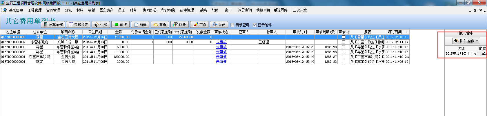 在工程管理軟件將所有人員實發工資做為一個總數錄入到【其它費用單】中,也可一個項目錄入一個【其它費用單】。工資單的可以通過Excel附件掛到其它費用單下。本方法適合企業已有相關的財務軟件或Excel來處理工資表,又不想在金石中花費精力詳細錄入。