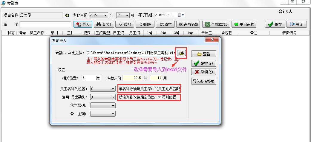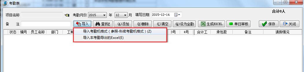 需要導入的Excel只有每人每月的合計工考勤,這樣只把每人的合計工導入到考勤表的任一天就可以,只要考勤表的合計工與Excel表的一致就行。