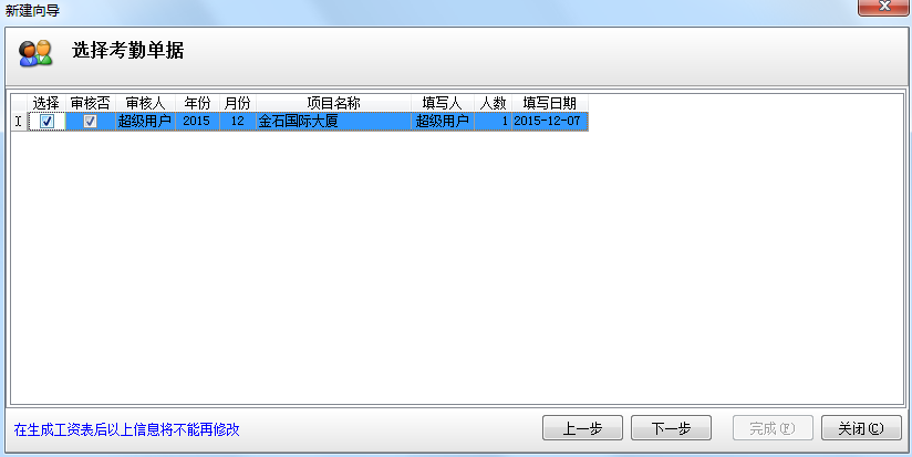 工程管理軟件在生成員工工資表之前將當月的考勤單據以及所有的影響到員工工資的單據審核完成(工資預支單、按月預支單、員工罰款單、員工請假單、員工加班單、工資項目定義、個人所得稅)。
