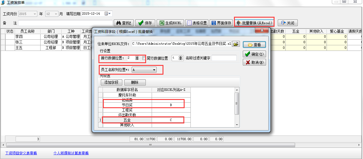 工程管理軟件 員工工資表的“批量替換”功能可將本地Excel表格中的工資數據替換到當前的工資表中,可用于替換每月每人不同的工資項目,例如計件,計件工資,五金,節日獎等。