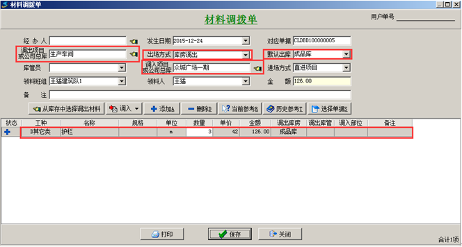 項目上使用產(chǎn)成品時,需要從“生產(chǎn)車間”將產(chǎn)品調撥到項目上,在工程管理軟件中做“材料調撥單”,填寫調撥單時,調出項目要選擇“生產(chǎn)車間”,出廠方式選擇“庫房調出”,并選擇對應的庫房,選擇對應的調入項目以及“領料班組”和“領料人”。如圖: