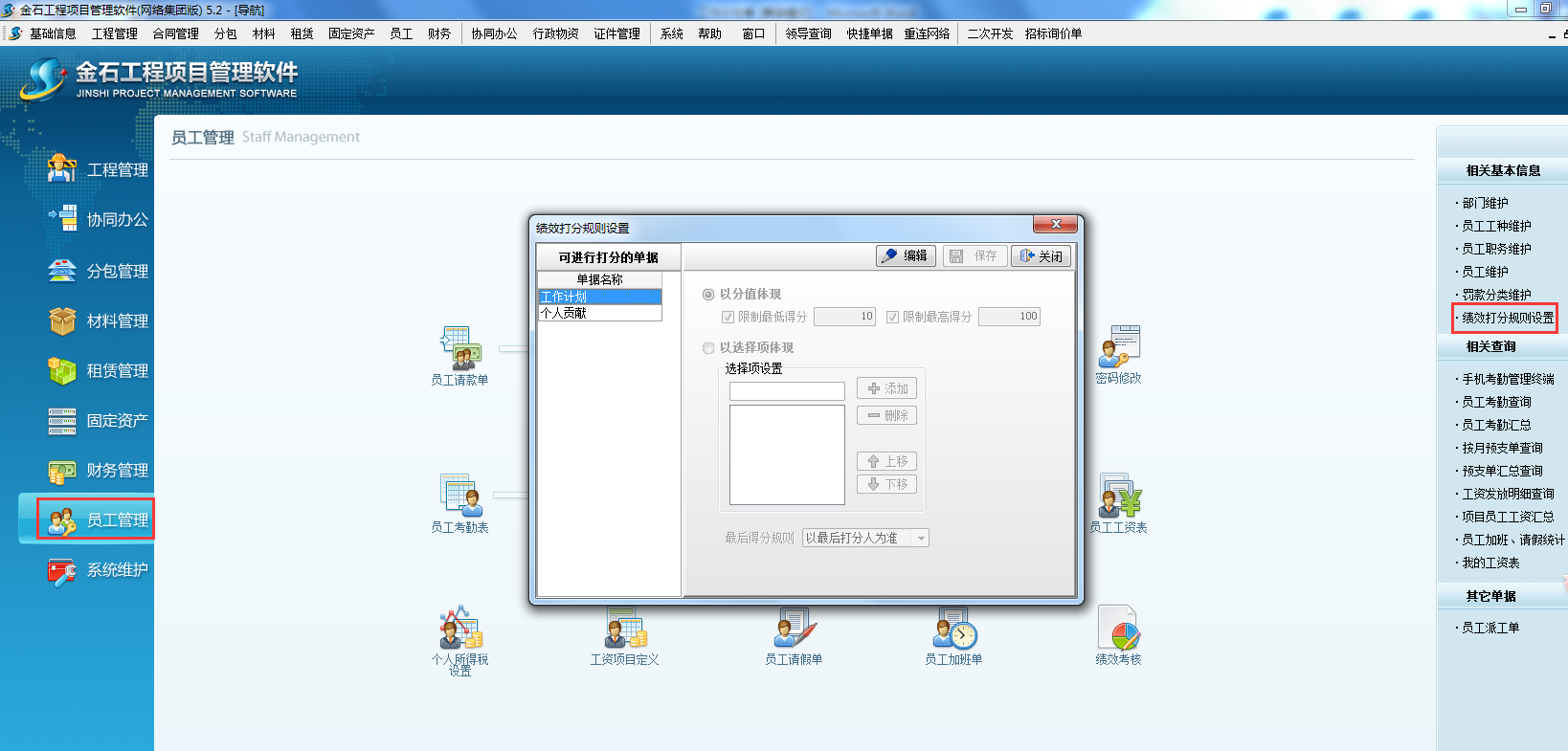 打開項目管理軟件【員工管理】-【績效打分規則設置】如下圖:
