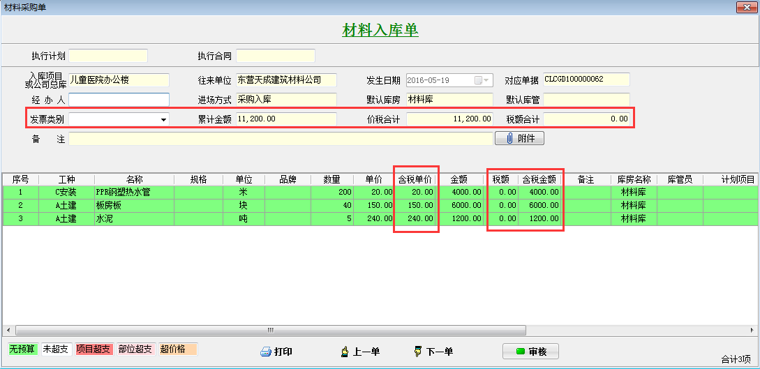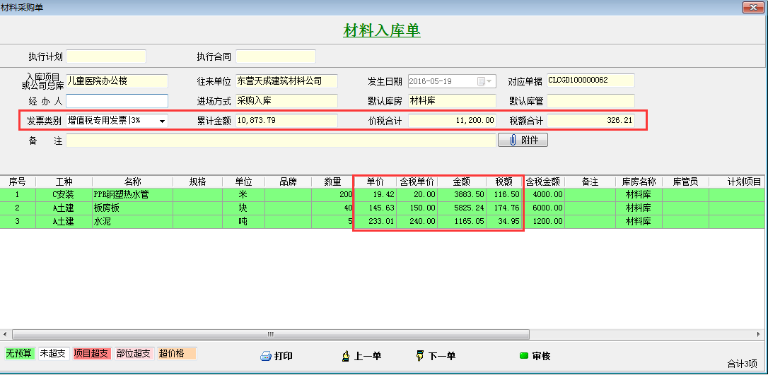 2.在營改增后.以前版本做的單據如何實現價稅分離調整?我們以材料入庫單(即材料采購單)為例,進行演示: