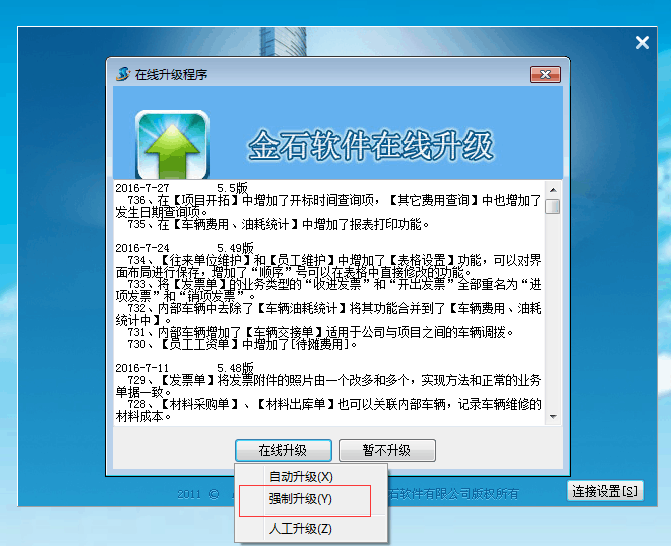 2.雙擊打開金石軟件圖標→連接設置→在線升級→強制升級
