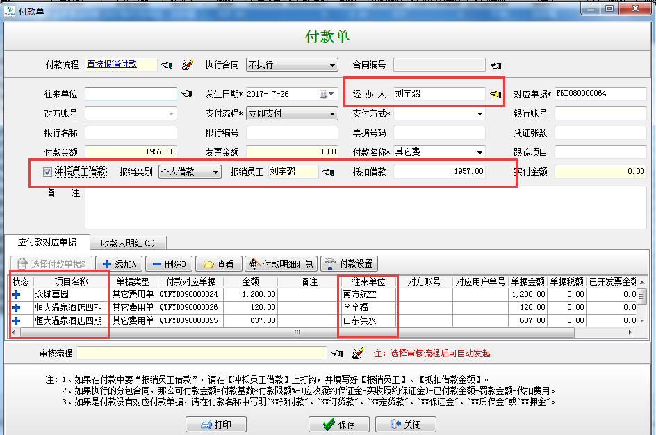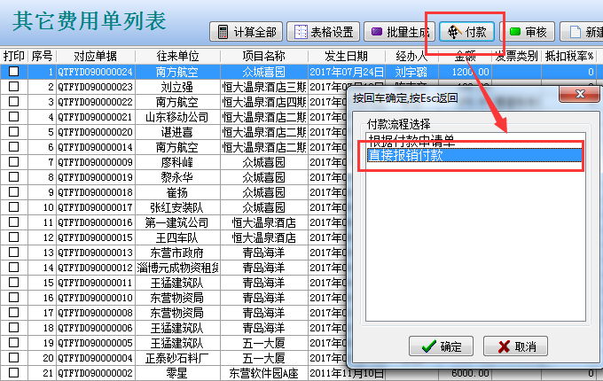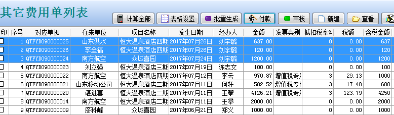 在工程項目管理軟件中如果某個員工在多個項目任職,又有多個往來單位都產生業務往來,都要進行報銷付款(沒有對應合同的前提下),按住ctrl鍵選擇待付款的單據(需單據的經辦人是相同的)