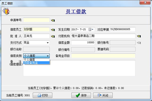備注:員工借款分為個人借款和項目備用金,其中選擇項目備用金主要用于大額的采購,是專款專用的,不能用于其他項目