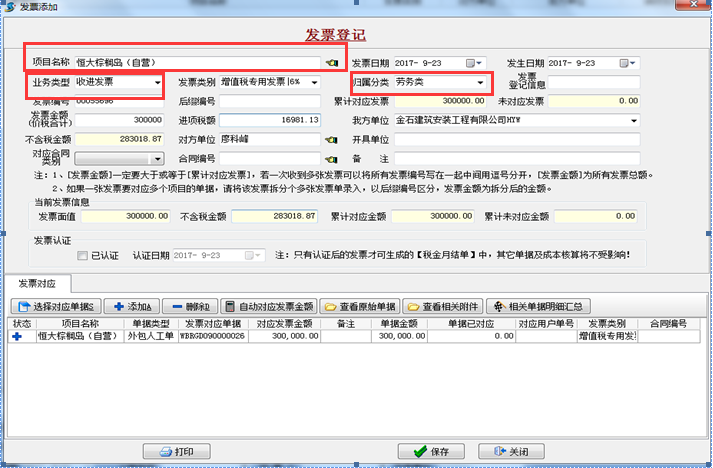 ②進項稅對應材料票:菜單欄【財務管理】→【發票管理】“收進發票”歸屬分類選材料票(在一個項目中應控制材料票、勞務票等所占的比例,此功能用于計算掛靠單位發票歸屬所占百分比)