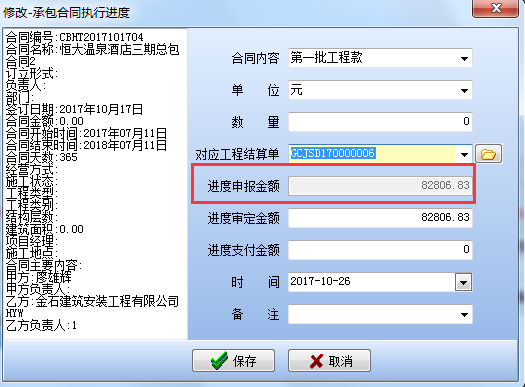 四、填寫“承包合同”執行進度,對應工程結算清單,(下圖)“進度申報金額”就是在工程結算單中填寫的暫估收款金額,“進度審定金額”就是報給甲方審定后的最終收入金額