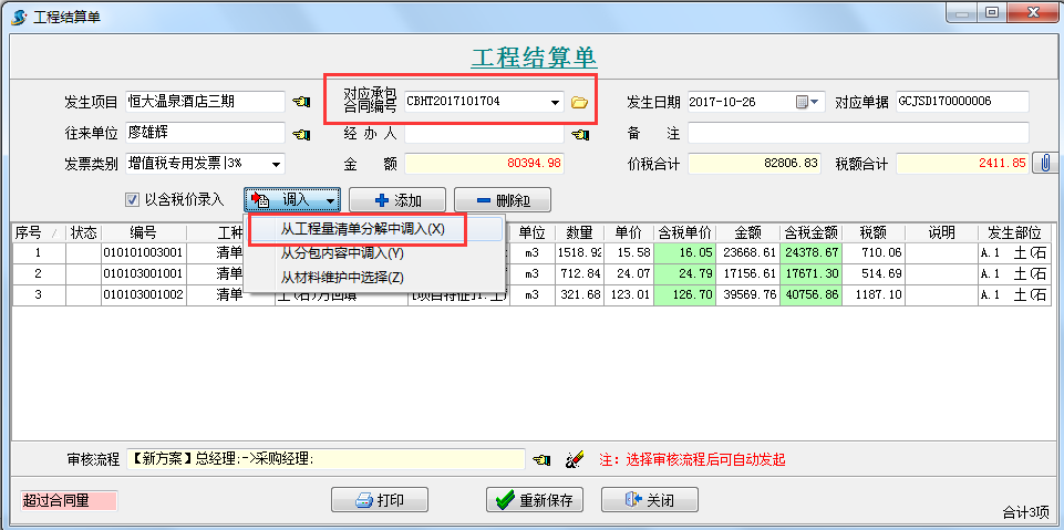 三、做工程結算單(暫估收入)對應承包合同編號,調入上圖中做好的“部位分解”中的清單內容