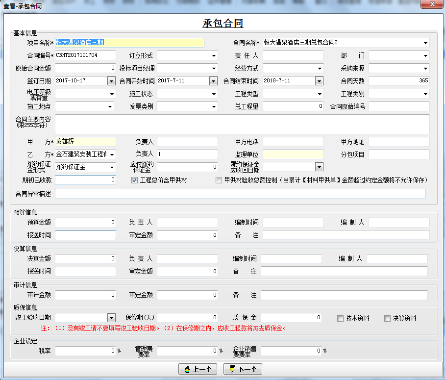 一、【工程管理】→【承包合同】 新建承包合同,選擇甲方、乙方等主要的合同內容信息