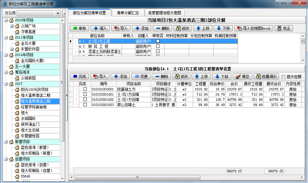 二、合同建立完成后,對項目進行部位的分解(支持導入廣聯達、智多星等主要清單軟件做出的工程量清單直接導入到軟件內,也可以根據軟件的格式編輯EXCEL表格進行導入)