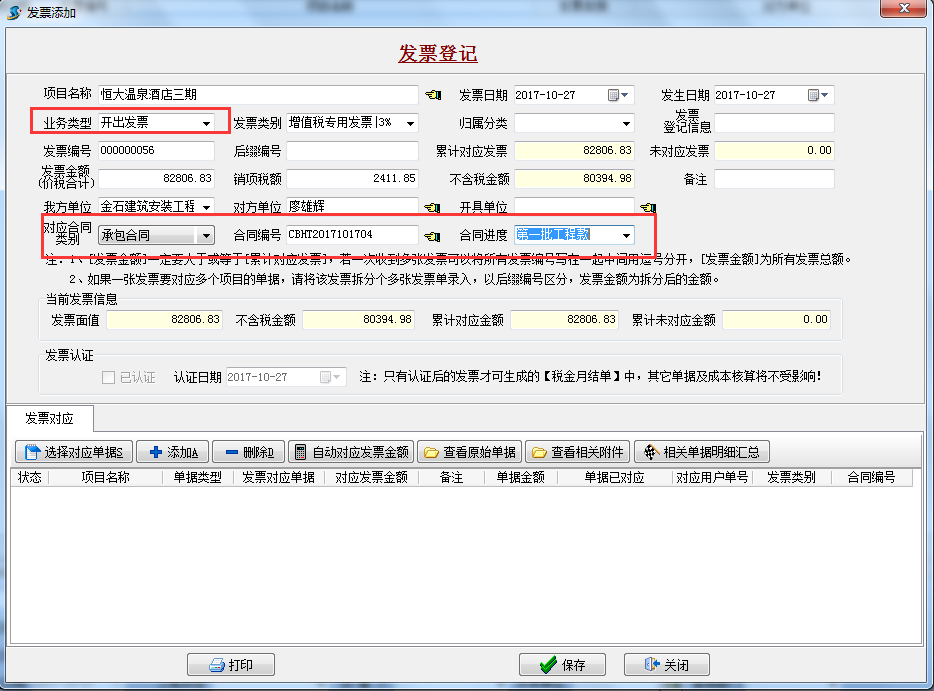 發票登記有多處需要注意,“業務類型”為開出發票(銷項稅),對應“承包合同”、“合同編號”和“合同進度”。
