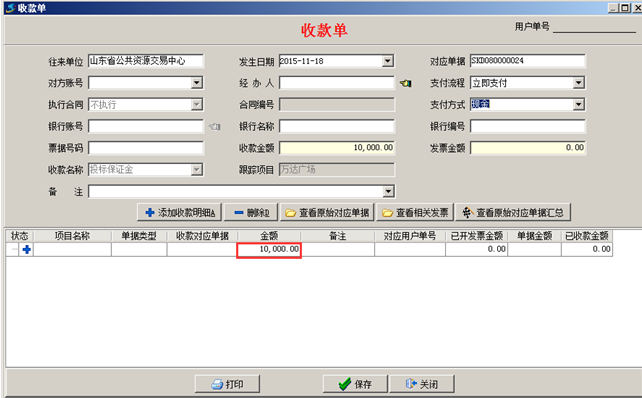 點(diǎn)擊“收到”,填寫收款單,輸入好保證金的金額,如圖: