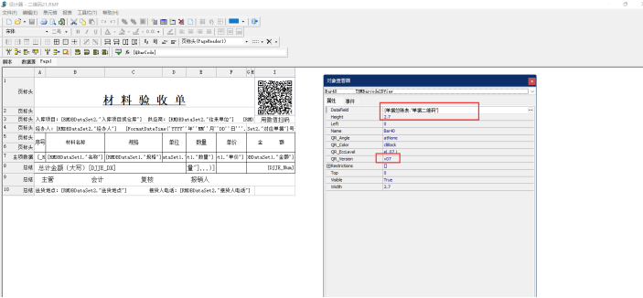 3、設(shè)置好二維碼樣式之后右鍵點(diǎn)擊單元格,點(diǎn)擊屬性。設(shè)置字符來(lái)源(datafield)為“[單據(jù)總賬表."單據(jù)二維碼"]”,二維碼版本(QR_vesion)為:v07