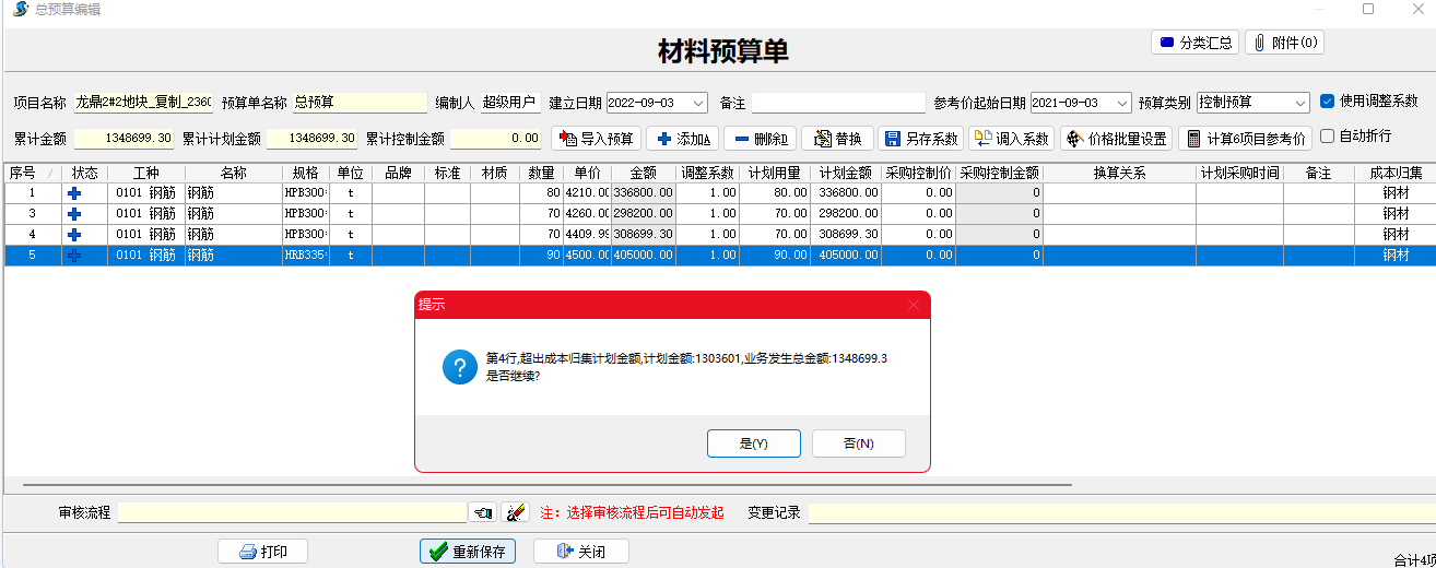 材料預算單超出成本計劃設定金額時系統會自動提示。