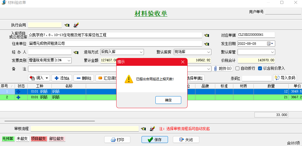 為了控制單據(jù)延遲上報(bào)時(shí)間,金石工程項(xiàng)目管理軟件專門開發(fā)了機(jī)械日?qǐng)?bào)單、材料采購(gòu)單、外包機(jī)械單、其它費(fèi)用單、外包人工單、采購(gòu)變更單、分包變更單、租賃變更單、其它變更單、銷售變更單等單據(jù)延遲上報(bào)天數(shù)設(shè)置。也就是企業(yè)可以自定義單據(jù)延遲上報(bào)天數(shù),單據(jù)發(fā)生日期超出上報(bào)天數(shù)時(shí)不允許保存。