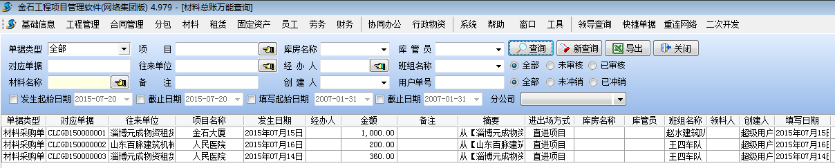 設置項目隱藏后查詢時不統計隱藏項目數據,我們以材料總賬萬能查詢為例,如下圖