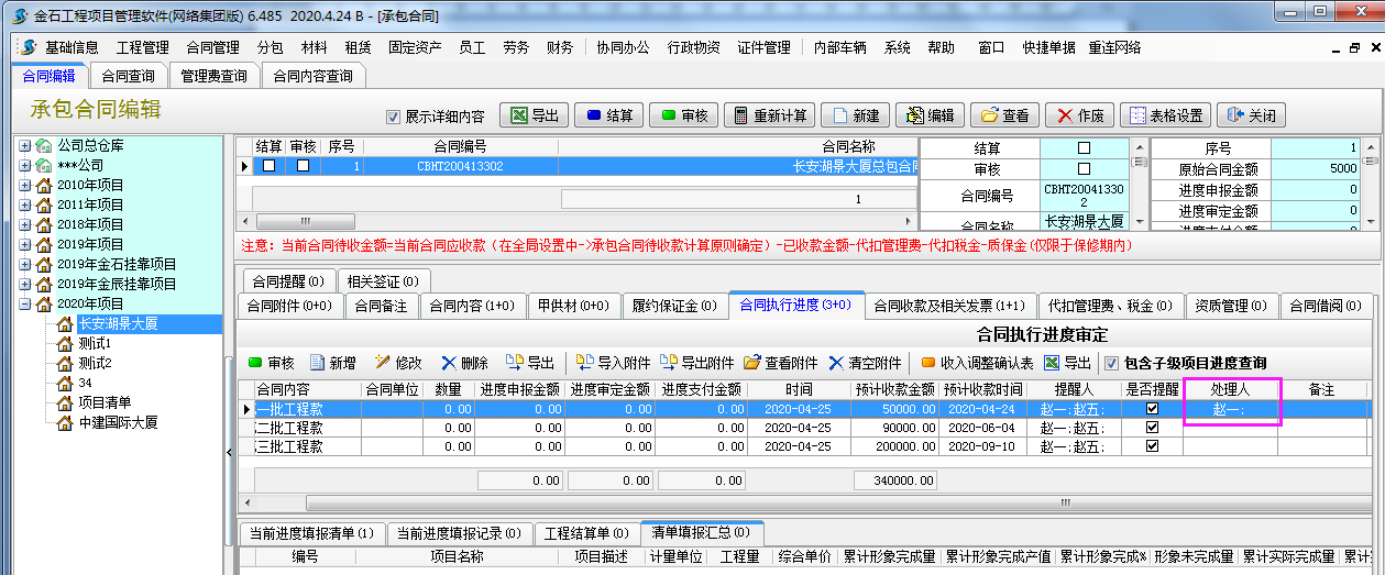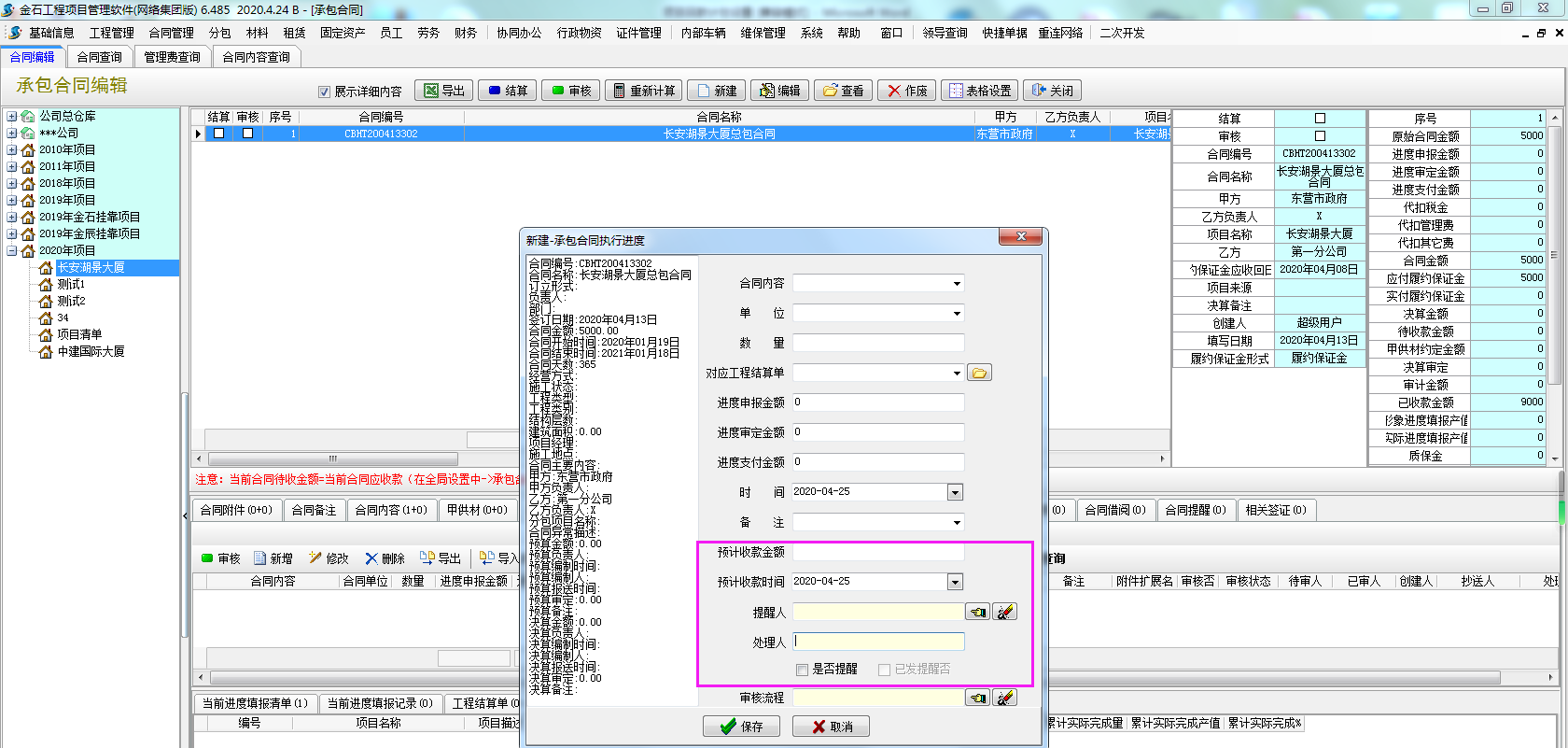 1、在【工程管理】-【承包合同】-合同執行進度,點擊新增,填寫預計收款金額、預計收款時間、提醒人、是否提醒。