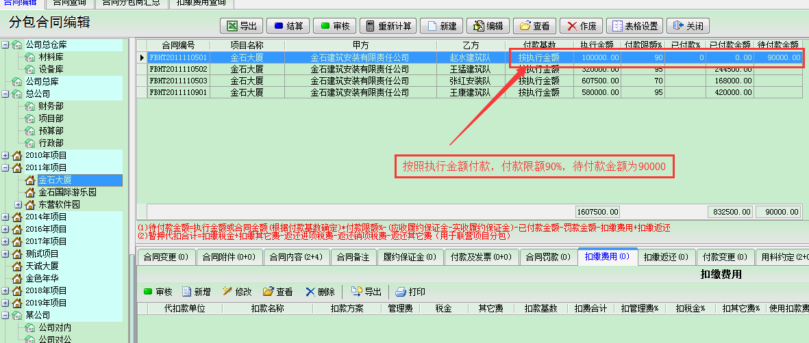 在工程項目管理中,工程款含甲供材費用的情況經常會遇到,若總包方對外分包而且分包款也是包含甲供材費用的話,同樣的在分包管理中就應該在分包工程款中扣除相應的甲供材費用?;蛘呶曳浇o分包商提供材料。為此金石工程項目管理軟件中做出相應的解決方案,以下為示例說明