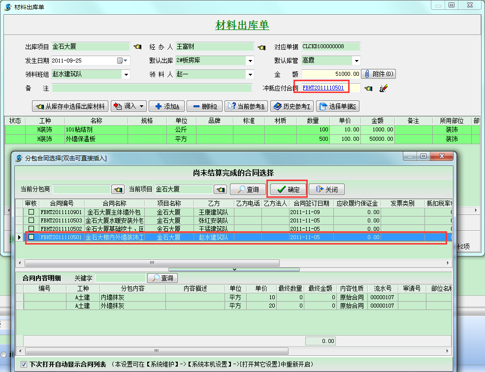 選定對應合同后,點擊保存,這樣就可以實現分包工程款的沖抵。