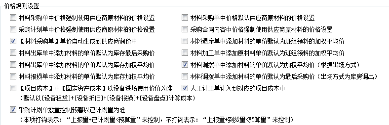 4、價格規則設置,里面包括材料計劃單、材料采購單及采購合同中材料價格幾種選擇方式,如強制使用原材料價格和默認使用原材料的價格。材料采購單單價自動生成到供應商詢價中,材料出庫單中添加材料的單價默認為庫存最后采購價,材料退庫單中添加材料的單價默認為班組領料的加權平均價,材料調撥單中添加材料的單價默認為加權平均價(根據出場方式)等開關。特別的,采購計劃單中,若以“上報量+已計劃量<預算量”來控制,需要開啟此開關。