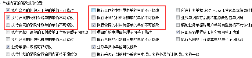 3、單據內容修改規則設置中,描述了以下幾種情況,執行合同的材料采購單、材料甲供單、采購計劃單、材料銷售單的單價不可修改,執行計劃的材料采購單的單價不能修改,執行計劃的采購合同內容不能修改。