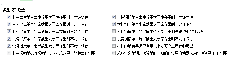 5、數量規則設置,在此開關中主要涉及,出庫數量大于庫存時是否允許保存。比如材料出庫單中出庫數量大于庫存時不允許保存。關于計劃單的開關,如材料采購單執行采購計劃時,采購量不能超過計劃量,采購計劃單調入預算是,新的計劃量自動默認為:預算量-已計劃量。