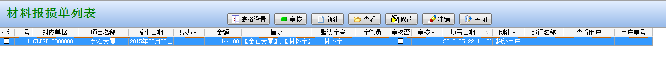 【保存】該單據,返回到【材料報損單列表】窗口下,如下圖: