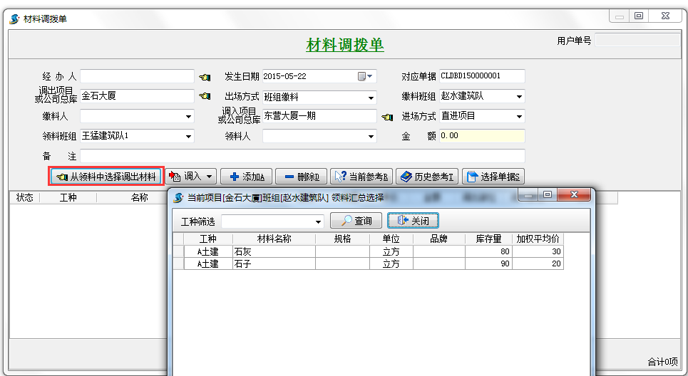 【材料調撥單】是當施工企業在工地現場材料管理中承接多項工程時,可能會需要把為某一工程購買的材料調撥給另一工程使用,將本公司的材料中轉庫的材料發到項目上,此時應填寫【材料調撥】單。錄入本單據前, 需先錄入要用到基礎信息中的【材料維護】、【項目維護】(包括【庫房信息】、【領料班組信息】)。該單據影響工地現場材料管理中基礎信息中的【工程成本】、【工程材料成本對比】、【工地材料用量查詢】、【工地材料庫存查詢】、【項目材料總量、單平方用量對比表】、【材料庫存(項目用量)、采購量匯總表】以及預算里的【材料對比表】、【材料超支查詢】、【項目材料超用、節余對比表】。