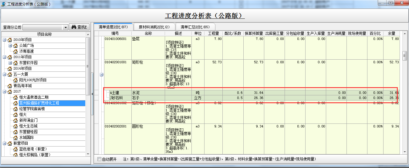 【編號、名稱、描述、單位、工程量、配比/系數(shù)】是根據(jù)軟件中部位分解及工程量清單設置得來的;【換算預算量】是根據(jù)工程量*配比/系數(shù);【出庫施工量】是根據(jù)做的材料出庫單或者材料調撥單出庫清單成本材料;【分包驗收量】是根據(jù)做的外包人工單計算得來的; 【生產入庫量】是根據(jù)做的材料加工單成品材料得來;【生產消耗量】是根據(jù)是根據(jù)做的材料加工單原材料得來;【現(xiàn)場使用量】是根據(jù)做的材料出庫單或者材料調撥單出庫原材料;【百分比】是根據(jù)出庫施工量/換算預算量;【余量】:第一級清單余量=換算預算量-(出庫施工量+分包驗收量),第二級、材料余量=換算預算量-(生產消耗量+現(xiàn)場使用量)。