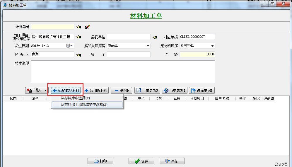 2.新建“材料加工單” 添加需要生產的成品材料,“從材料加工消耗維護中選擇”(上圖中做的材料加工消耗維護)
