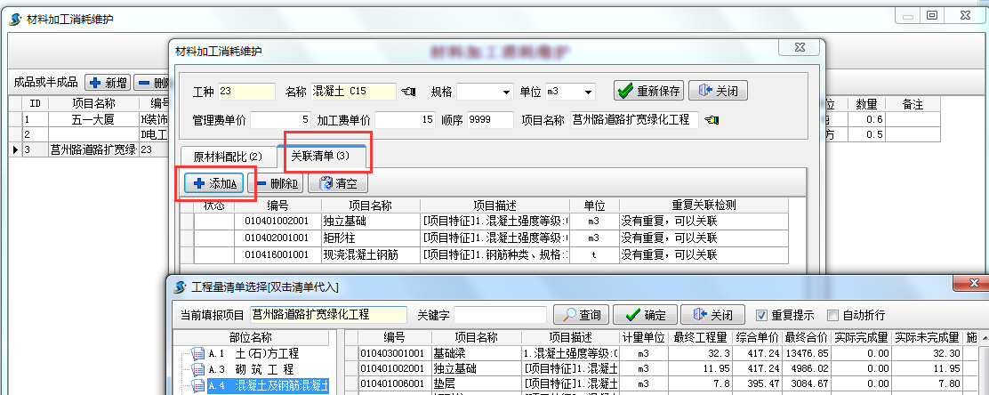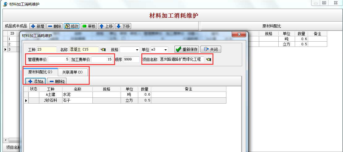 生產1立方混凝土用水泥0.6噸,石子 0.5立方,關聯(lián)清單 為3項表示該配比實用于以下3種清單 的混凝土。