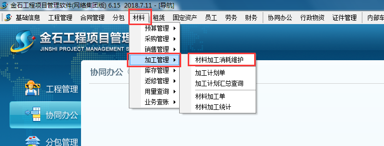 在軟件“材料”模塊找到“加工管理”→“材料加工消耗維護”→“關聯(lián)清單”