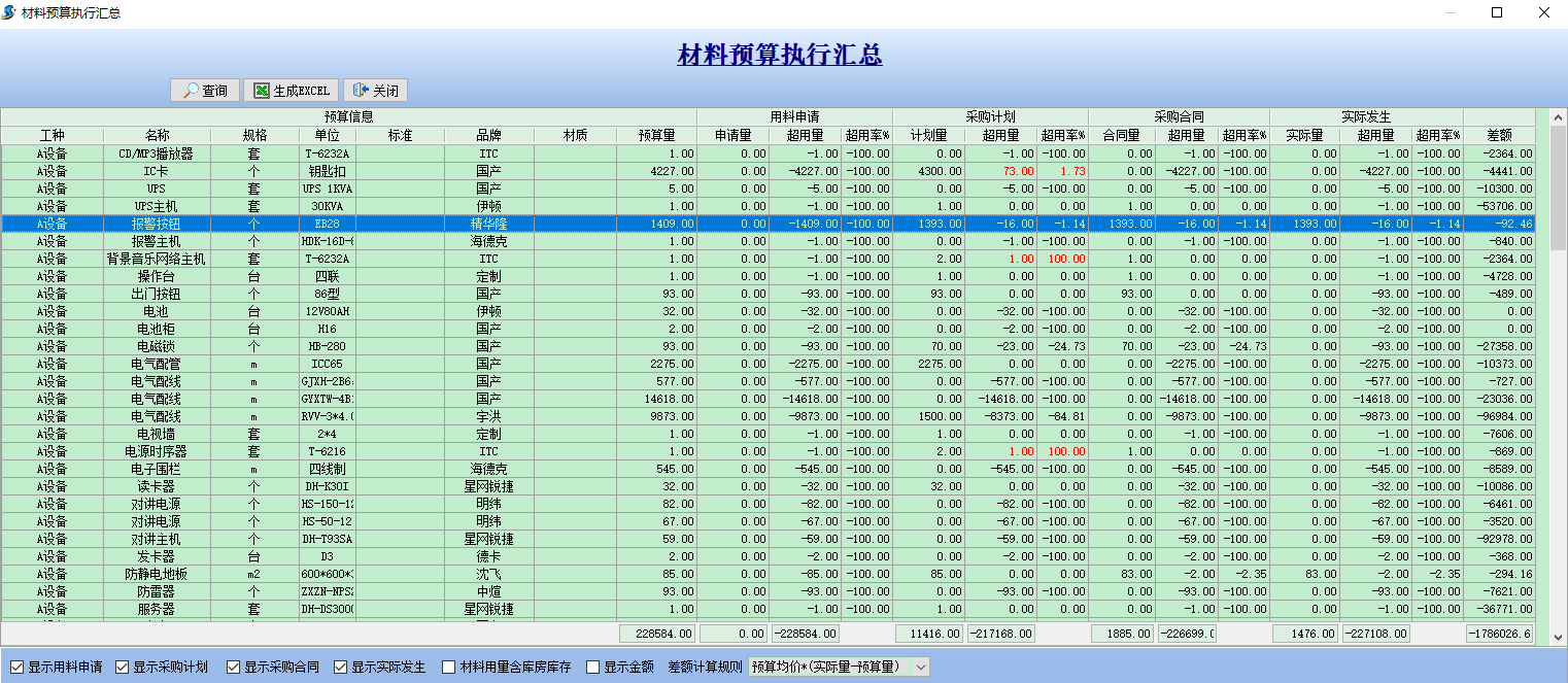 如果想全面統計材料用料申請、采購計劃、采購合同及實際發生等詳細情況,可以通過材料預算執行匯總來查看,如下圖所示: