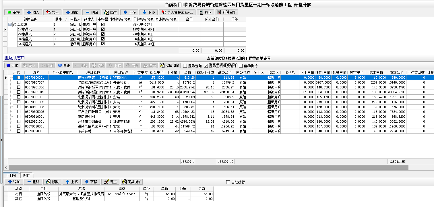 工程管理模塊下,【部位分解及工程量清單】中,部位部位分解中增加‘合價’、‘成本合價’和‘價差’三個字段,旨在體現出當前部位下合同清單金額、成本清單金額(由企業清單中工料機計算得出)和兩者的差值形成的價差(實際就是利潤)。如下圖所示