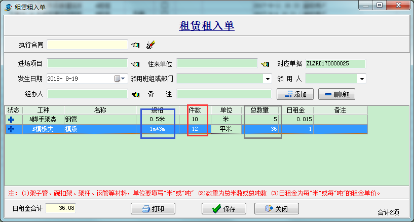 當(dāng)開啟此開關(guān)時(shí),我們?cè)谧鱿鄳?yīng)租入單、還租單等業(yè)務(wù)單據(jù)時(shí),相應(yīng)租入材料系統(tǒng)會(huì)自動(dòng)做相應(yīng)換算,由根數(shù)自動(dòng)換算成米(計(jì)費(fèi)單位),由此可省去用戶自己去做換算的過程,大大加快了錄單效率。如下圖