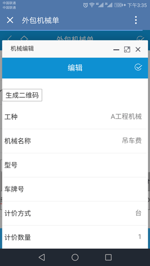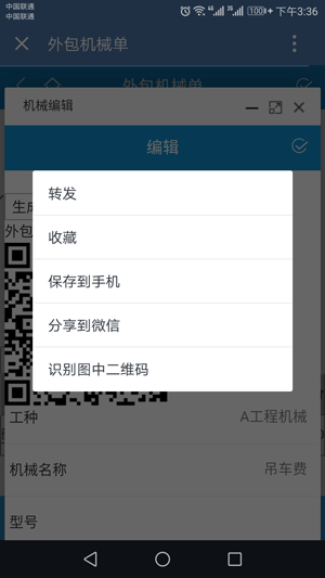 2、金石工程管理軟件手機端也可以生成二維碼,在配置好企業微信的前提下,進入手機端的單據填寫并打開外包機械單,如圖所示
