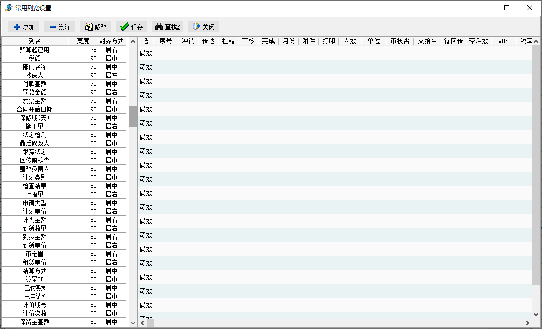 六、常用列寬設(shè)置 - 對列表或查詢表格中不同字段的列寬做單獨設(shè)置,分字段名、寬度和對齊方式3種設(shè)置,字段名必須與列表或查詢表格中的字段名一致,否則無法生效;寬度為字段的顯示寬度,原則為恰好或更好顯示當(dāng)前字段內(nèi)容為準(zhǔn);對齊方式分居中、居左和居右3種方式,原則上推薦數(shù)字類居右顯示,其他字段可根據(jù)用戶個體習(xí)慣自行設(shè)置,設(shè)置界面圖如下: