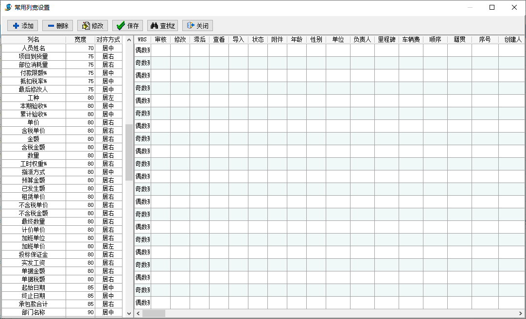 對單據表格中不同字段的列寬做單獨設置,分字段名、寬度和對齊方式3種設置,字段名必須與列表或查詢表格中的字段名一致,否則無法生效;寬度為字段的顯示寬度,原則為恰好或更好顯示當前字段內容為準;對齊方式分居中、居左和居右3種方式,原則上推薦數字類居右顯示,其他字段可根據用戶個體習慣自行設置,設置界面圖如下:
