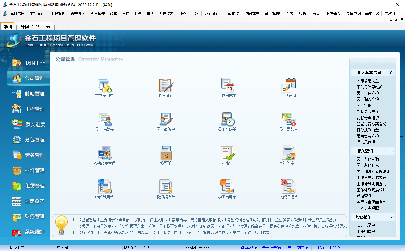 增加了公司管理,前期管理和勞務管理的導航模塊。公司管理模塊包括行政部門主要的管理內容,如員工維護、員工考勤單、員工請假單、員工加班單、員工罰款單等員工管理的內容;如物資入庫單、物資領用單、物資借用單、物資歸還單等行政物資的內容;還增加了投票單和考核單的內容。前期管理模塊主要包括項目收集單、項目開拓、投標資料庫、報價資料庫和投標人員業績查詢等內容。勞務管理模塊主要是把原菜單的內容添加進來,讓導航模塊內容更充實。