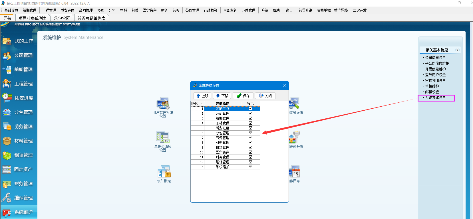 導航增加公司管理、前期管理、勞務管理、維保管理。導航界面可以調整顯示模塊。