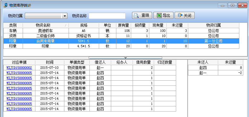 物資庫存統計可以很方便查詢物資的借還記錄,物資借還人以及物資的未還量。當物資借用人想借用物資時,可以先查看物資庫存統計,方便借用物資。