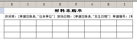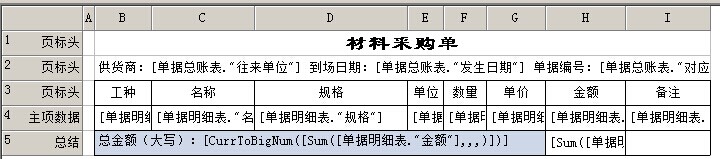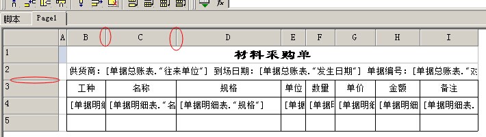 7. 把單據中需要打印的內容,放入表格中。例如:材料的工種,名稱、規格、單位、數量、單價、金額、備注等,如下圖,在第三行中我們輸入名稱,第三行中輸入對應的字段名稱。