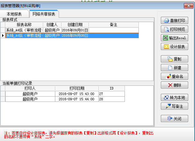 (1) 開啟【打印次數顯示】的單據報表設計只能由“超級用戶”來管理。(2) 在單據的【打印報表】界面下點擊【打印】后,無論是否打印成功,打印次數將自動加1。