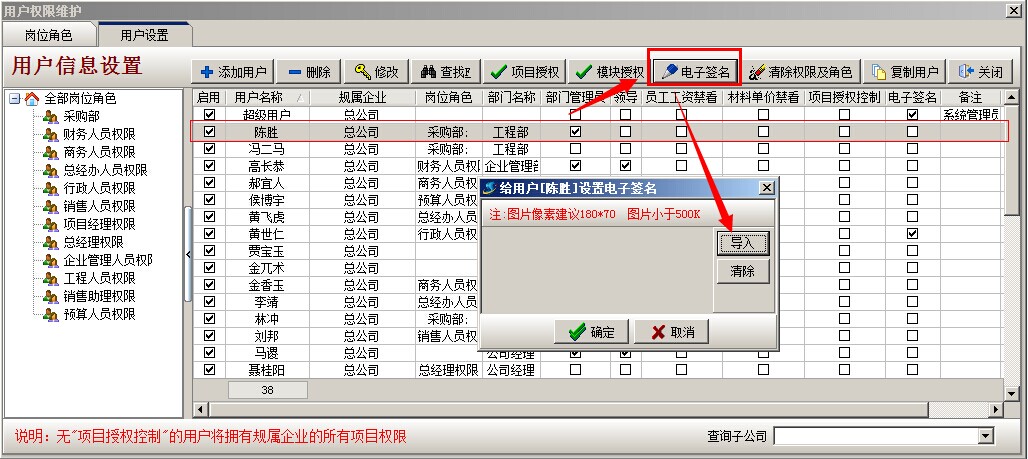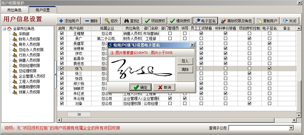 登陸超級用戶,選擇系統維護模塊,打開用戶管理權限設置,選擇需要設置電子簽名的用戶,點上面的電子簽名,對應導入提前設置好的電子簽名圖片(jpg格式)