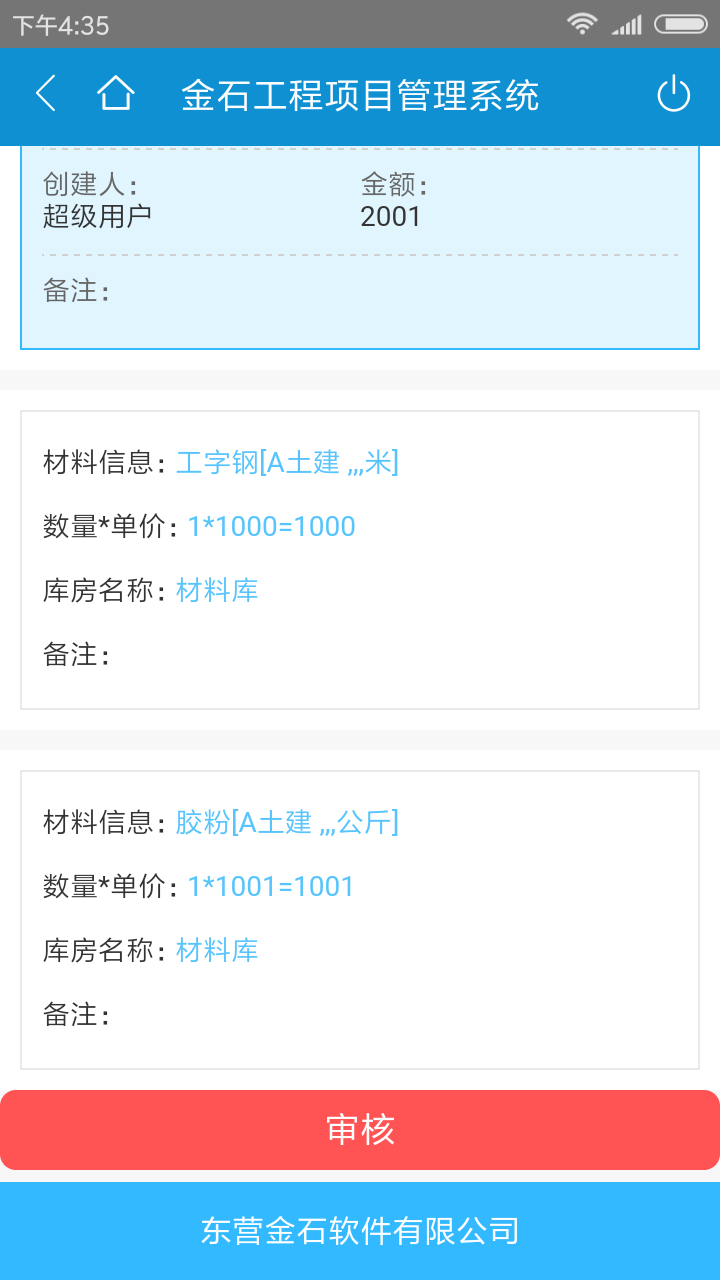 2.金石工程管理軟件手機端的操作,在配置好企業微信的前提下,進入手機端的單據填寫并打開審核中心,如圖所示