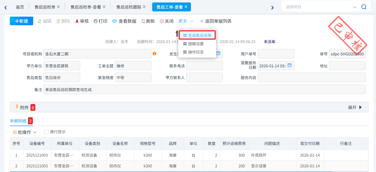 經領導審核后,派單人員可以根據售后巡檢跟蹤生成售后工單