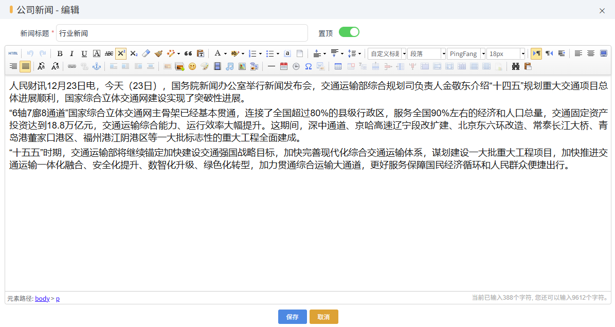 新建公司新聞,輸入新聞標題,置頂與否,下方的是新聞內容,根據需要調整段落格式,字體等,如下圖所示: