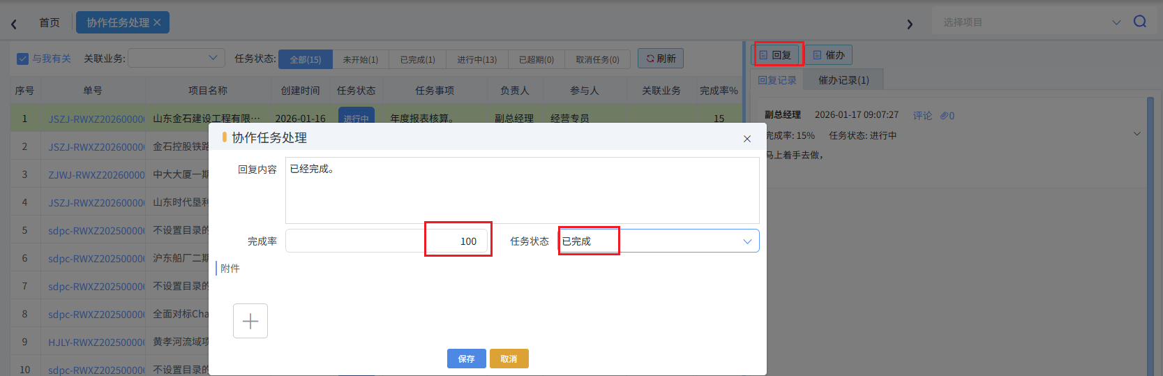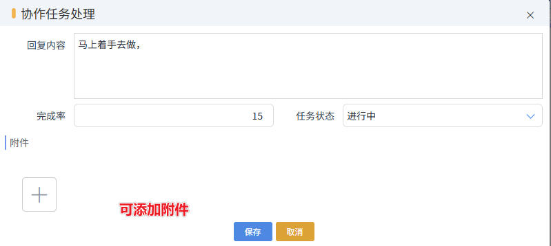 例如,負責人點開查看任務后,在協作任務處理中,對當前任務進行回復,如下圖所示: